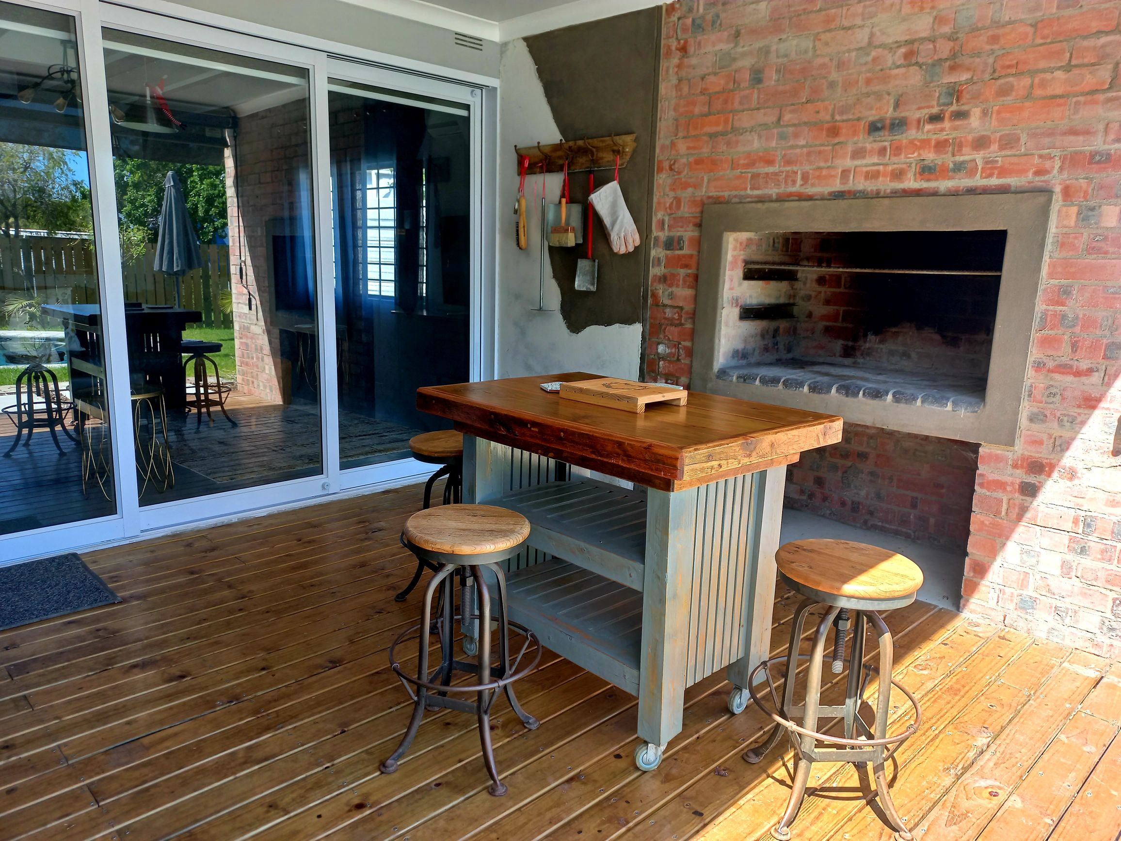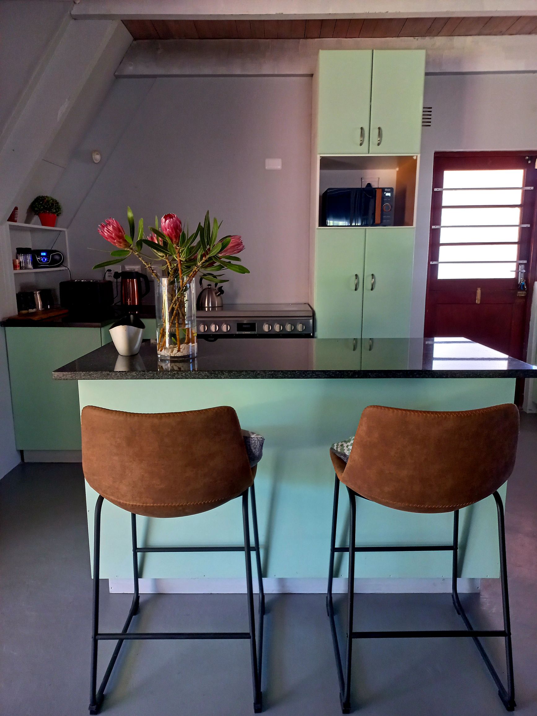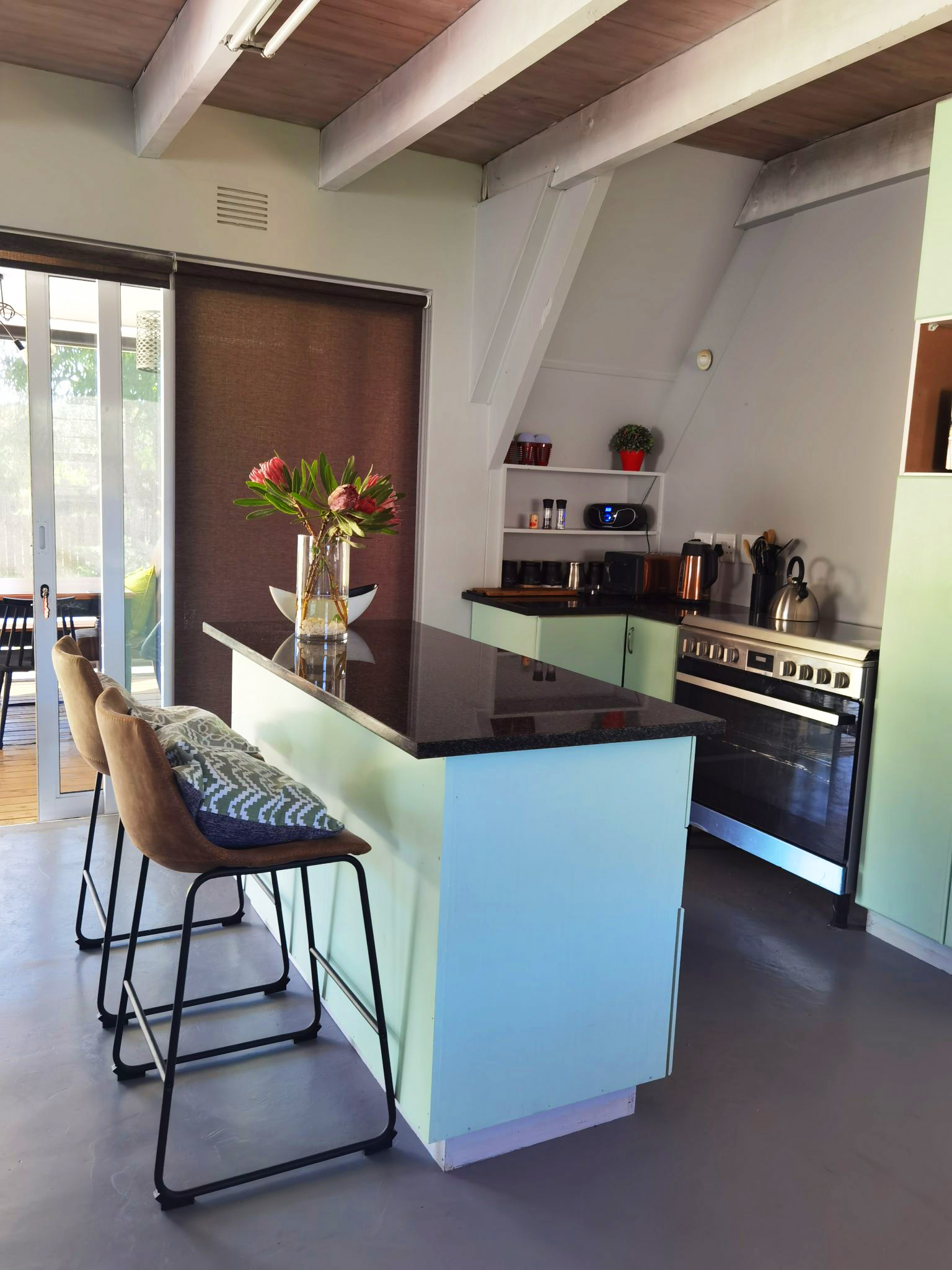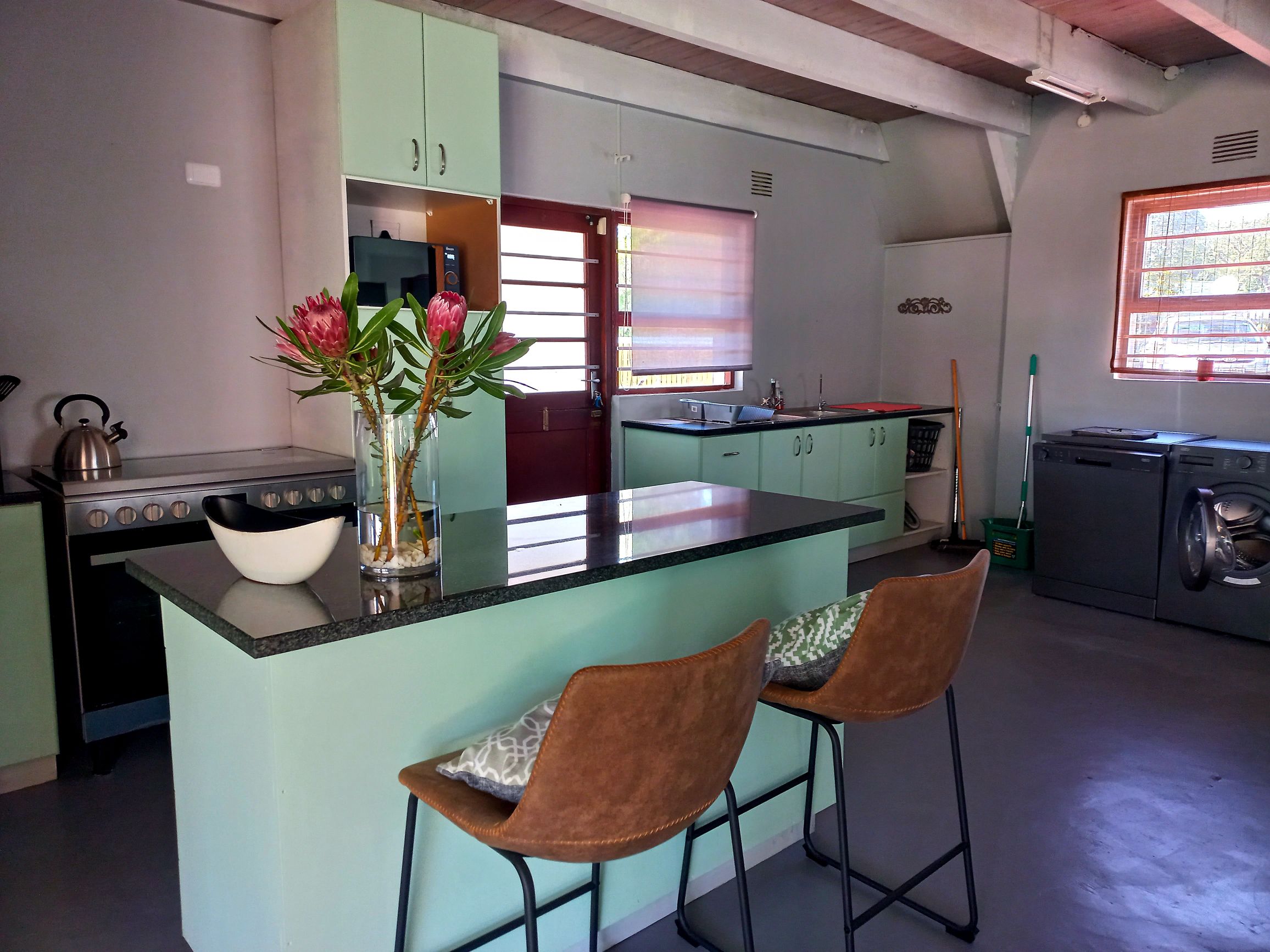 The open-plan kitchen on the ground floor is stocked with everything from glassess and cutlery to dishes, pots and pans. The kitchen is equipped with a full-on gas stove and oven, microwave, dishwasher, washing machine and more. The kitchen opens up to the main lounge area, and leads off to the braai and pool area.