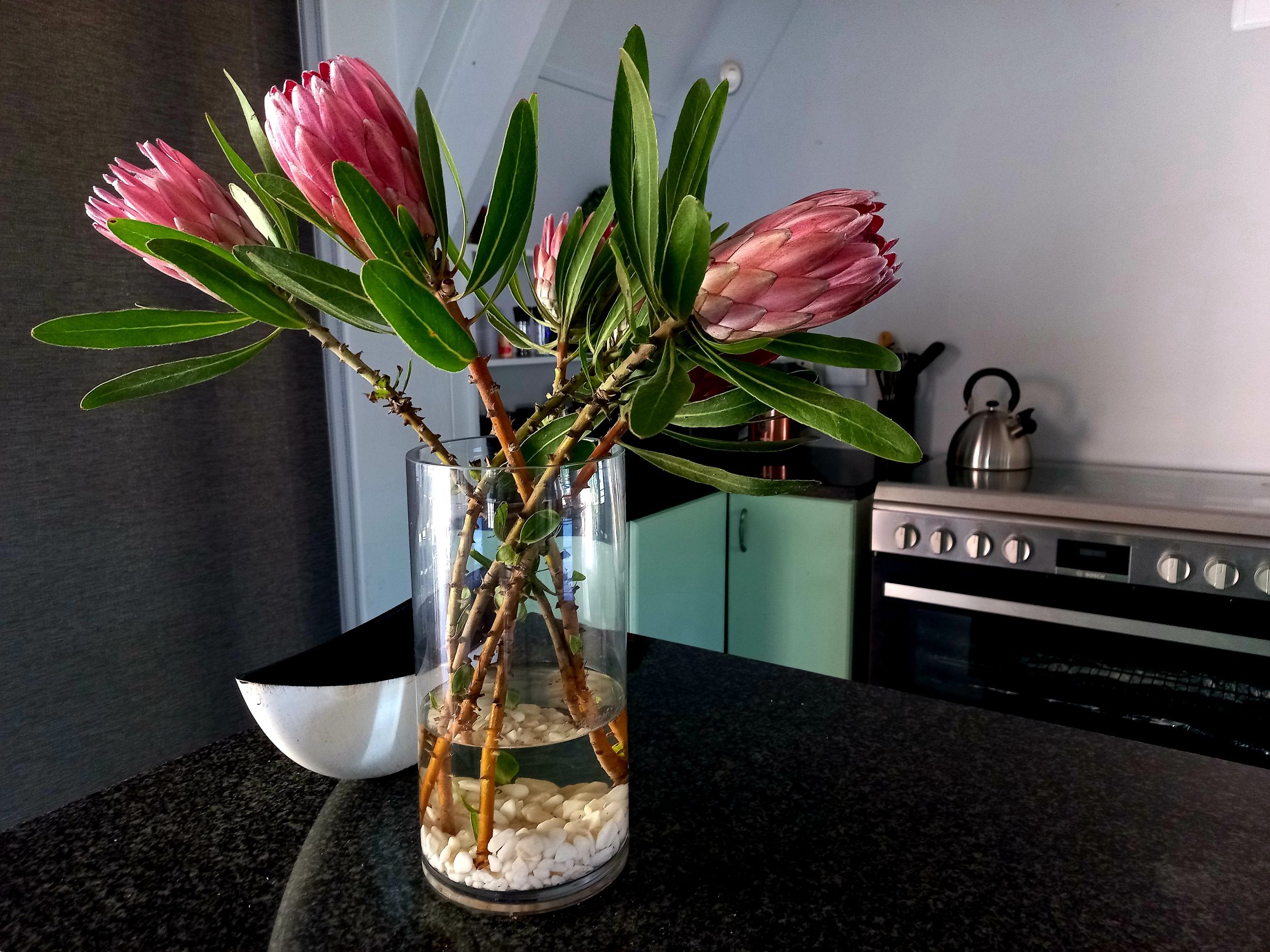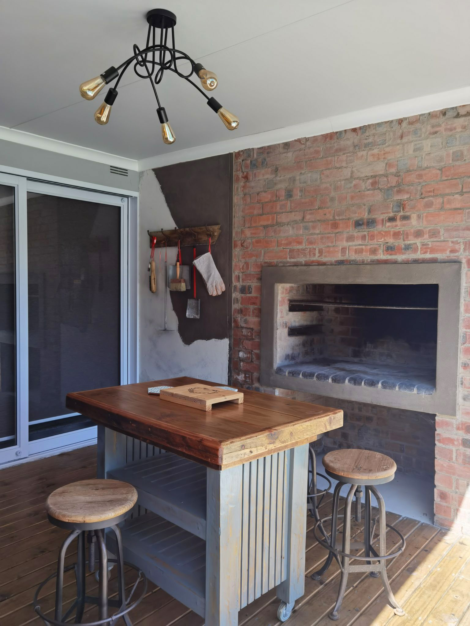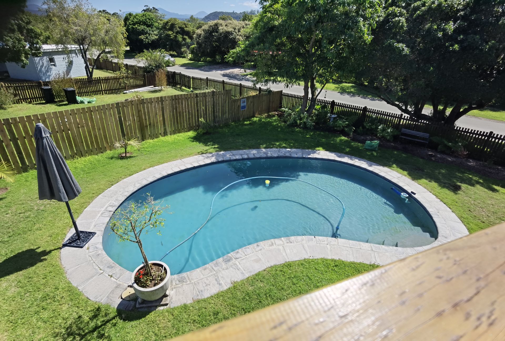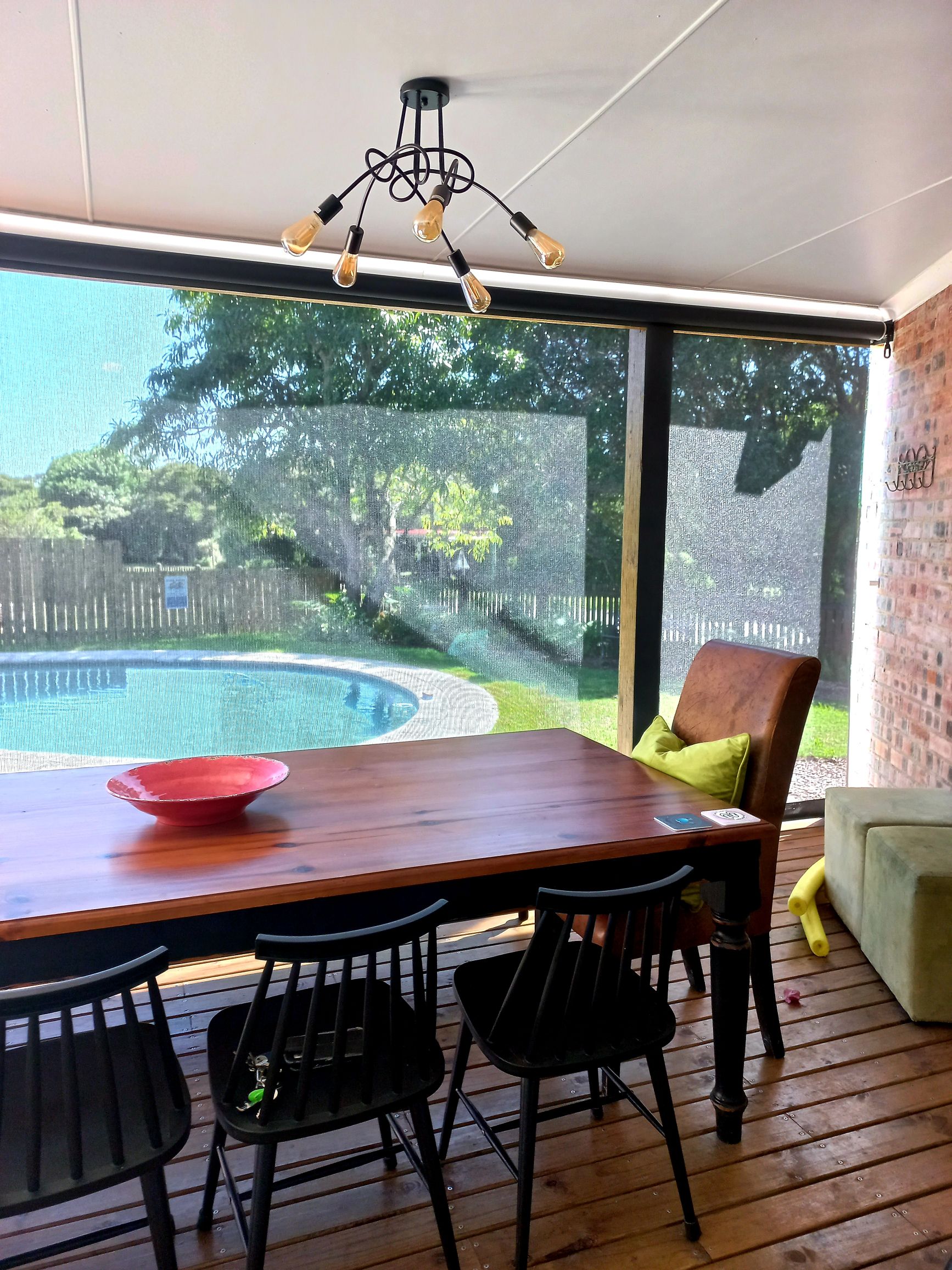 The open-plan kitchen on the ground floor is stocked with everything from glassess and cutlery to dishes, pots and pans. The kitchen is equipped with a full-on gas stove and oven, microwave, dishwasher, washing machine and more. The kitchen opens up to the main lounge area, and leads off to the braai and pool area.